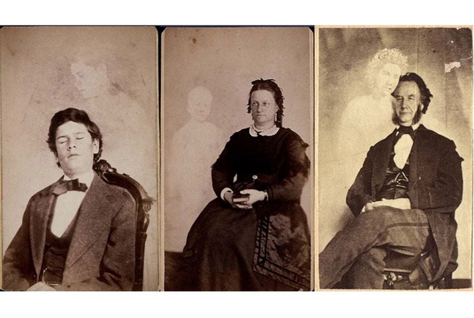 Look closely at this trio of haunting portraits. On the left, a young man with eyes shut tight—behind him, a figure emerges. In the center, a stern Victorian woman with a child’s ghost clinging faintly at her shoulder. On the right, a gentleman with a mysterious glowing angel above his head. Each image suggests an unseen presence, quietly invading moments meant for the living.