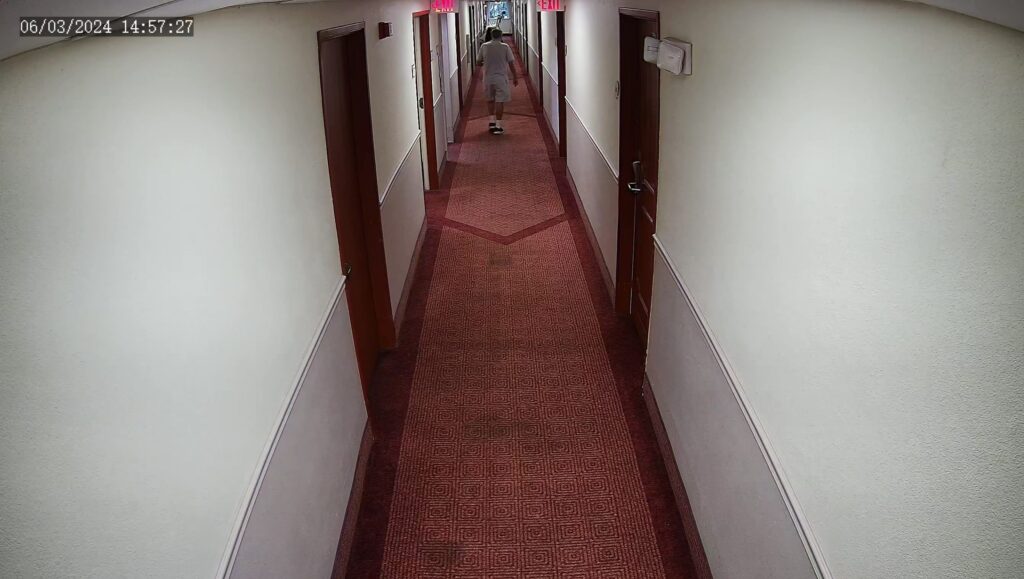 The clip comes from a standard security camera inside a building. Fixed angle. Empty hallway. Nothing that looks worth sharing.